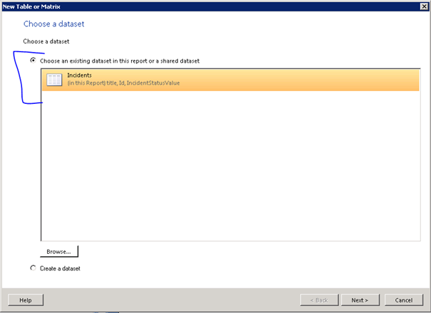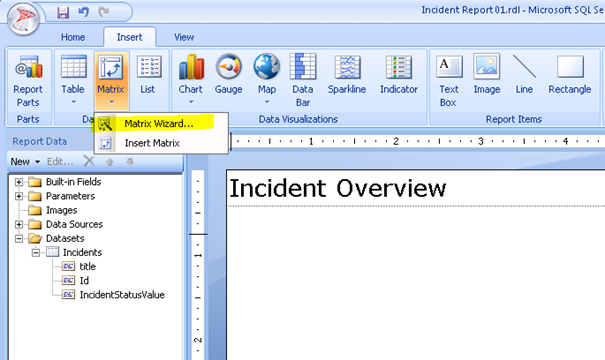 When the data set is ready we are ready for the fun part: report design! Report Builder brings lots of options to present data in different forms, simple tables, cool gauges, charts etc. I select a Matrix. This is a more complex table that also allows grouping of data.