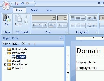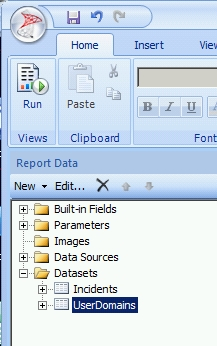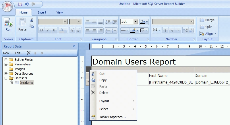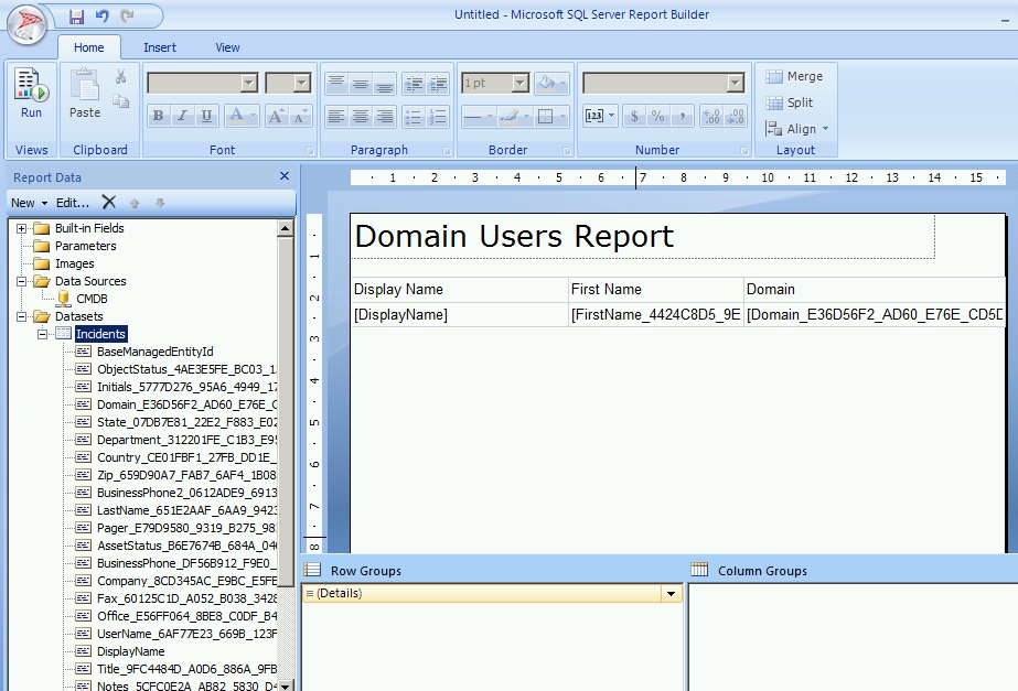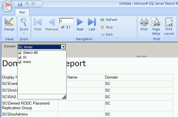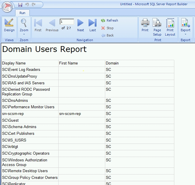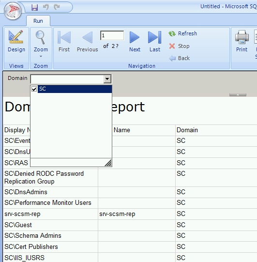 I will again use SQL Report Builder V3 for this. First create a new report that displays some information. In this example I have a very simple reports that displays Domain User information directly from the CMDB. One column shows the domain name where the user accounts lives.