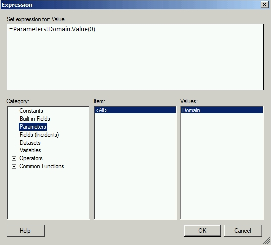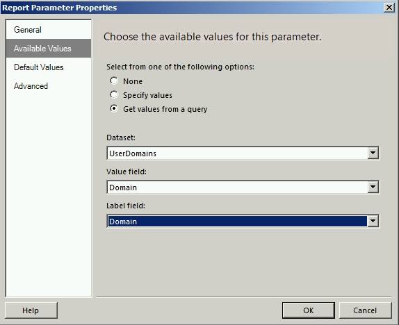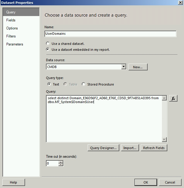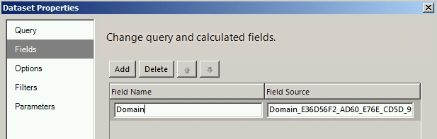 The available report parameter values are working great, but the values are static. There may be times where you want to have dynamic values available to select. This is indeed possible by using queries to populate the selectable values. To make this work, we need to add another data set that gets the available values from somewhere. In this example I want to get all the available domains directly from the CMDB. So I prepared a query that gets those.