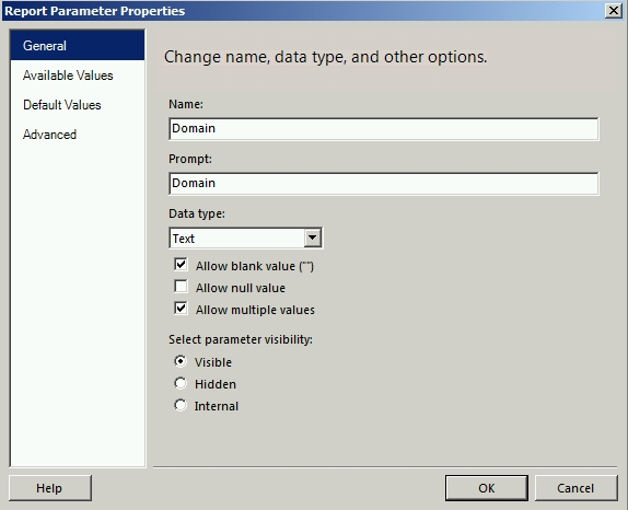 Now let’s add a new parameter to the report, define a name for it, define the data type and some other options. In this case I want to allow the report user to select multiple values if needed.