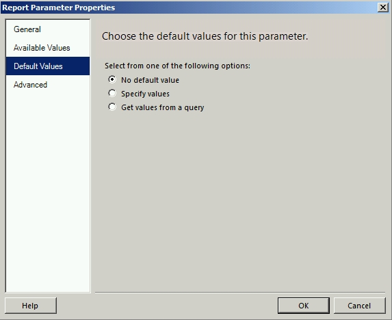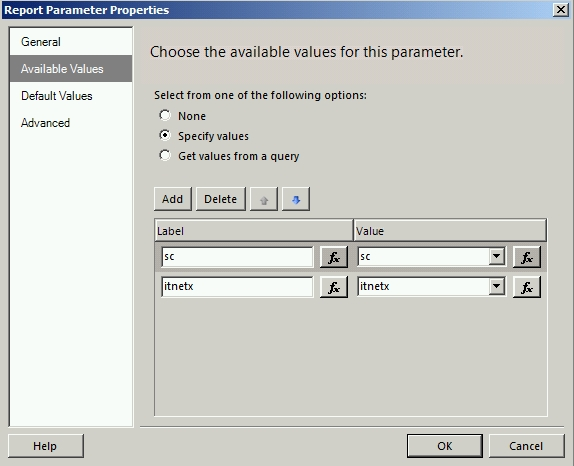 For the selectable values we have two options. Either we can specify manual values or use a query that gives us back available values. I will show how to define values manually and come back to the query-based approach later. So I just enter some static values that will be selectable when executing the report. If needed, a default value can also be set.