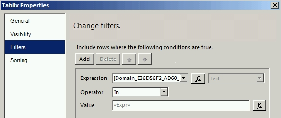 For defining the filter, I add a new entry and configure the expression. I select the domain field, define the operator (in this case “in” because I defined that multiple values can be selected) and then define the value. The value will be the user selection. Using the button, the parameter can be selected (double click).