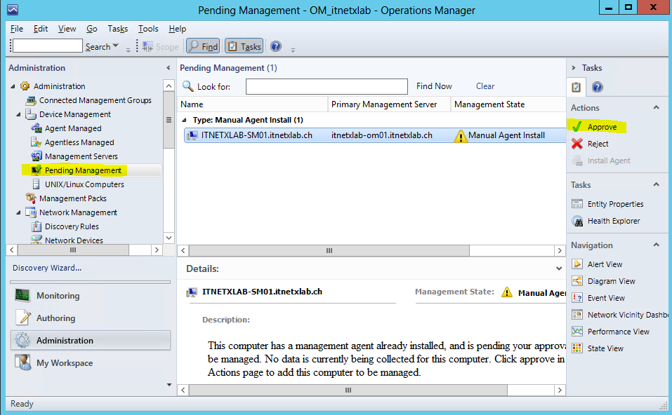 After configuration is done, make sure your SCOM infrastructure allows the manual installation of SCOM Agents because this is treated as a manual installation. If needed, approve the new SCOM Agent. Now you are ready to monitor your SCSM Management Servers with a SCOM agent in place – as in the old days Smile