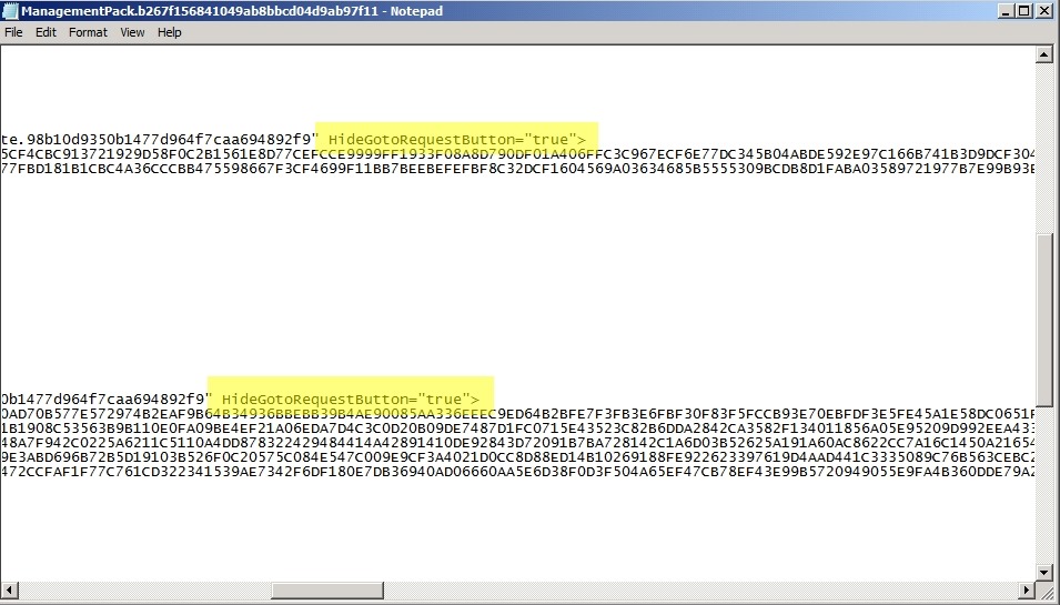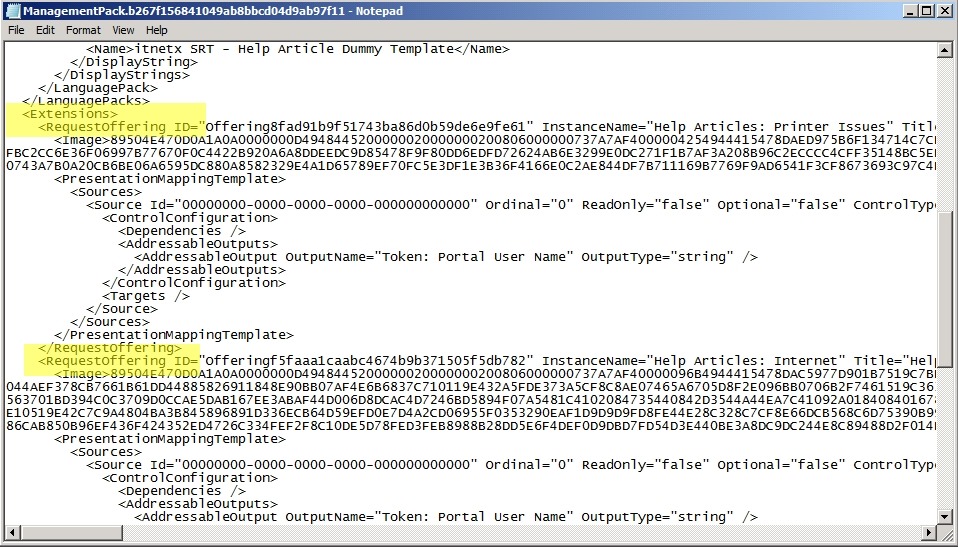 As a last step I want to remove the “Go to Request Form” button from the Request Offerings because I dont want users to go to the form (that does not really exists). This can only be done with some XML editing. So export the MP that holds the Offerings and open it in your favorite XML editor. Then search for the Request Offerings.