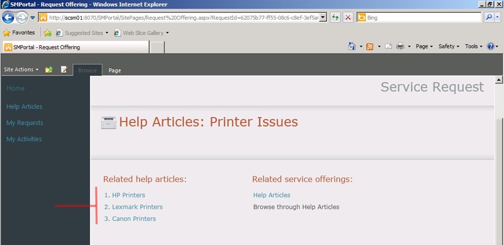 A way to solve this is to structure the articles in a way that consumers are comfortable with – for instance it makes sense to use a product or technology-based structure. This is how the end result could look like: users access the portal and will find a Service Offering called something like “Help Articles”.