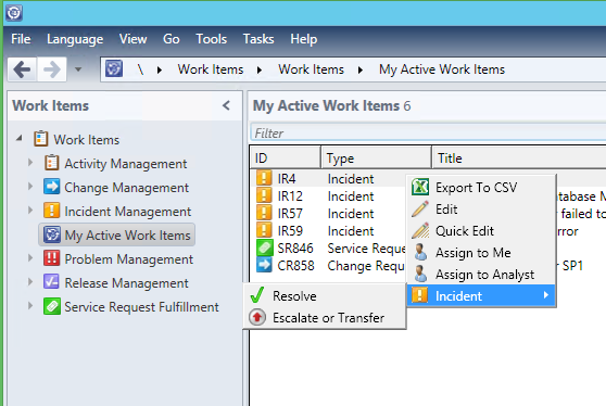 The views is very flexible and allows for groping or filtering of Items. It’s also possible to display Work Items assigned to other Analysts which is very helpful in Service Desk Scenarios.