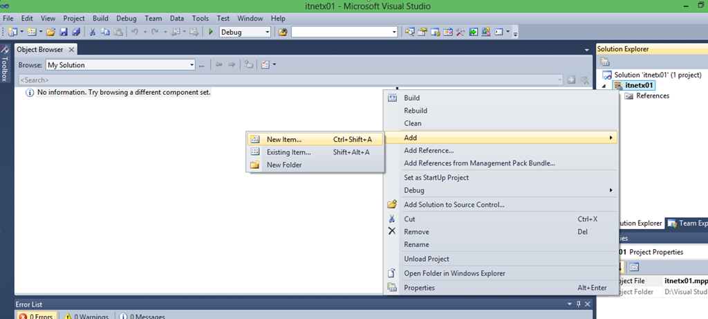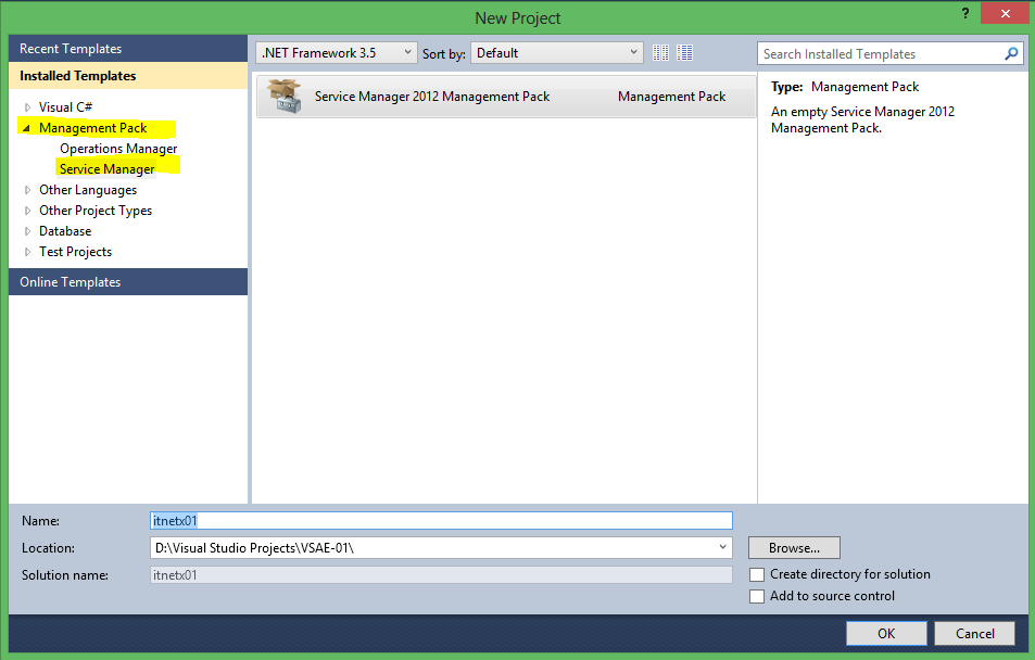 First you need to install Visual Studio 2010. After that, download and install the Visual Studio Authoring Extensions from here. Now start Visual Studio and create a new Project. Select “Service Manager 2012 Management Pack”, select name and location for the project and the solution.