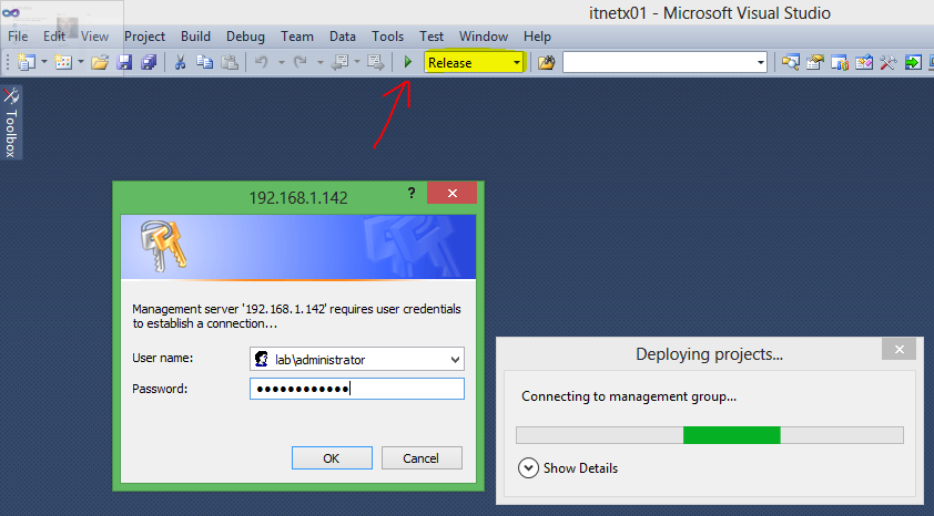 Now, to deploy the MP bundle to the Management Group you need to start the debugging process in Visual studio. If you specified to use different credentials to connect to the Management Group, you are prompted for those.