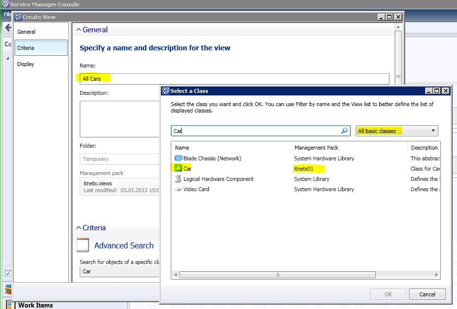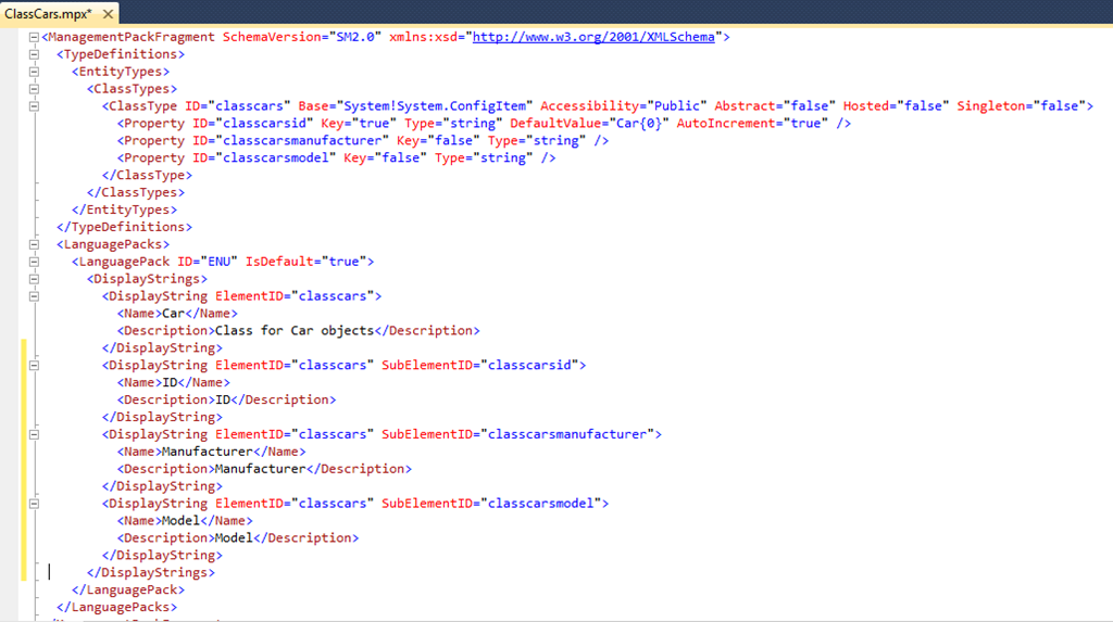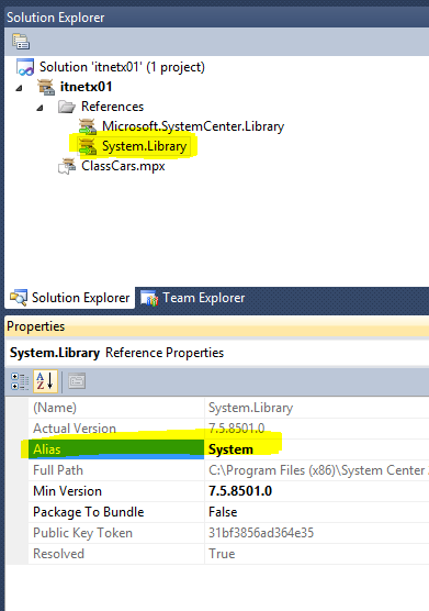 In this example I will create a new class called “Car” which will later be used to store information and relationships about car CIs in the CMDB. That means that some things need to be changed from the example class. Because I want to add another CI class, I need to derive from the Configuration Item class System.ConfigItem.  Because this class lives in another Management Pack, we need to reference to this class to get the base class. This is one of the default references that is already there. The alias is predefined and is called System.
