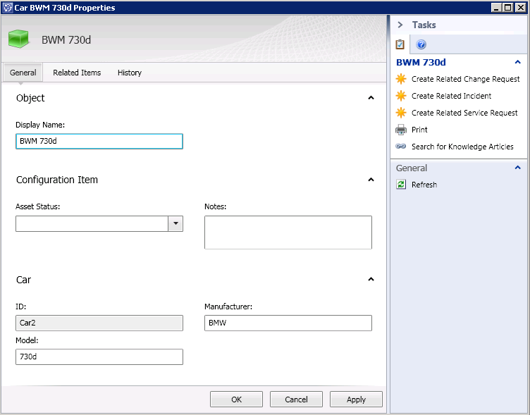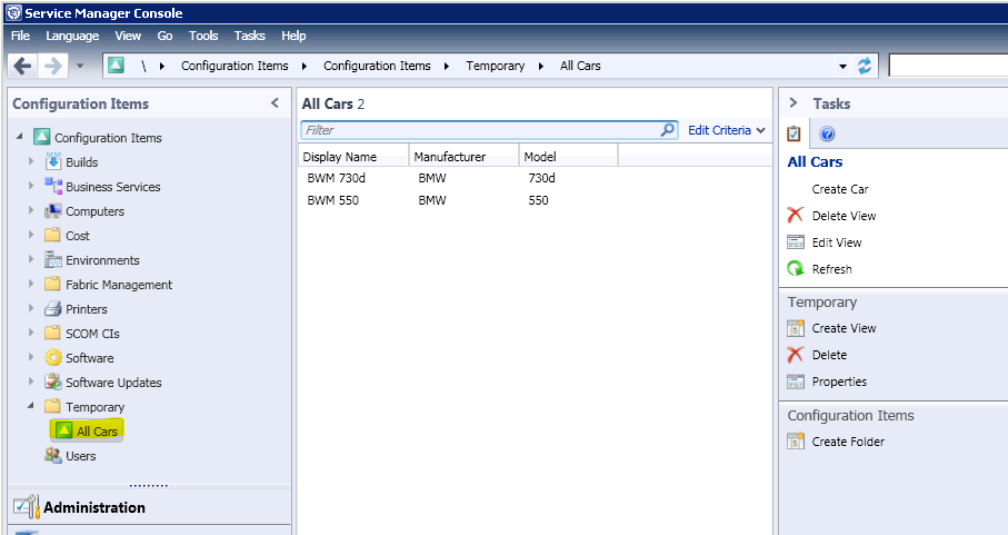 Because I only created a class in this example, we are not able to see anything for now. But you could now start creating views and use the created class to display and create car CIs. Something like this.