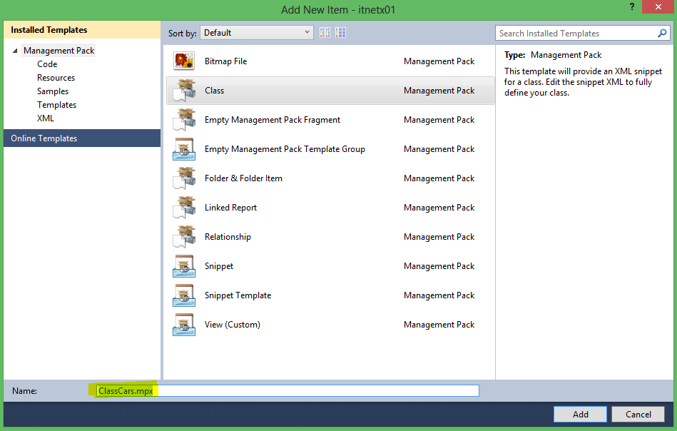 Now let’s add a class to our Management Pack project. You can do this by adding a new item. Select the Class template and define a meaningful name.