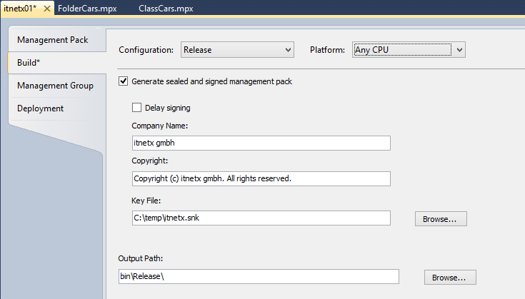 If needed, the Management Pack can be automatically sealed before it is deployed to the Management Group. This makes sense if the MP holds type definition. In this example, I choose to seal the MP, define the path to the strong name key file which is needed for the sealing process. You can get more information about that here. As a last step, I change the Configuration and Platform options as shown in the Screenshot.