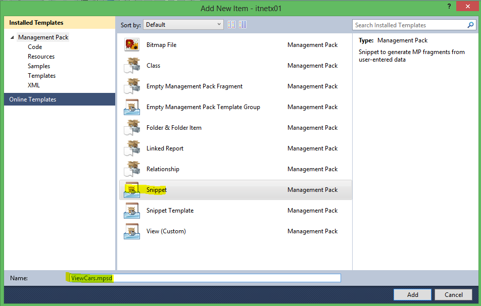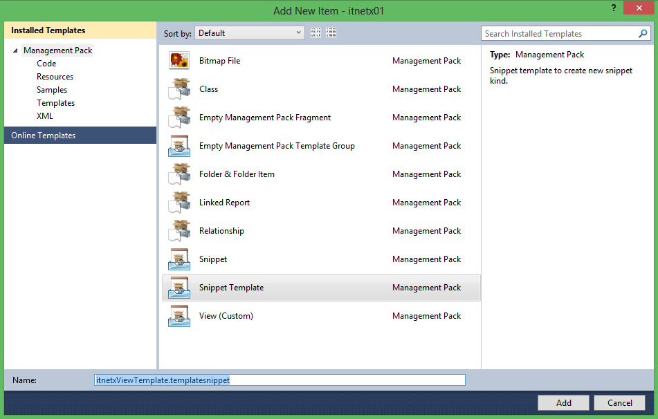 VSAE offers multiple options to create views. You could use the View template or an empty Management Pack Fragment template. For this example however, I decided to use a snippet template to demonstrate how this can be used to create your own templates for your needs. It is indeed very powerful and can save you lots of time for repetitive tasks.