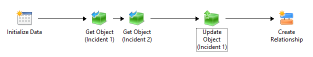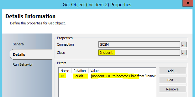 Now we have to get the Incident Object that will become the parent from the Service Manager database. Use class “Incident” and filter based in on the ID. Use published data from “Initialize Data”.
