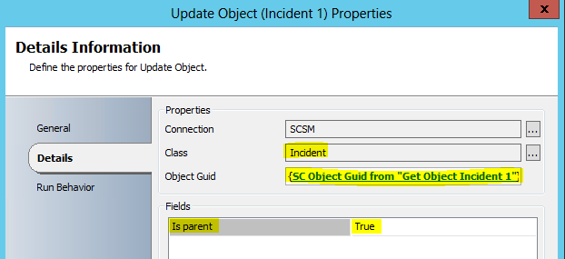 The next activity will mark one Incident (IR1795) as the parent Incident. For this we must use Published Data and get the SC Object GUID of Incident 1. Then we update the property “is parent” to “true”.