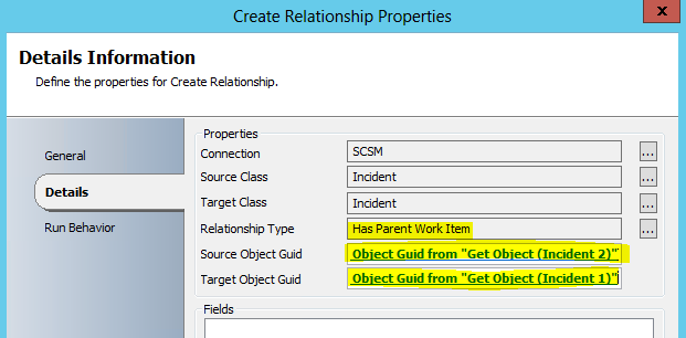 As a last step, we can link the Incidents together. In the “Create Relationship” activity we have to select the source and target class (in this case “Incident” for both) as well as the relationship type “Has Parent Work Item”. To make sure the correct objects are linked together we must again use published data (SC Object GUID) to define the source and target object. The source is the SC Object GUID of the Child Incident, the target the SC Object GUID of the parent Incident.