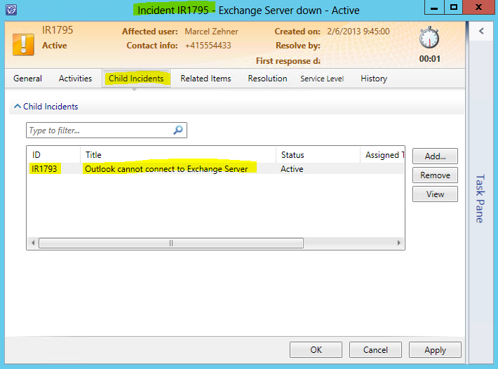 Because 1 Incident (IR1793 – Outlook cannot connect to Exchange Server) is a direct result of Incident 2 (IR1795 – Exchange Server down), it can make sense to link them together. This is especially the case when more and more users start calling Service Desk because they cannot use Outlook anymore.