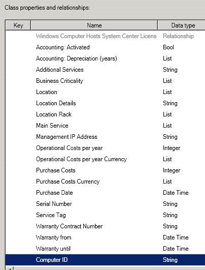 We have lots of Service Manager customers that have comprehensive CMDBs where they store all kind of object types and relationships. When defining your very own classes you know that every class should have a key property. Often this is property is called something like “ID” and will contain an auto incrementing value, e.g. “Car1”, “Car2” etc. so that you don’t have to take care about setting a unique value for every instance. Default classes also have key properties, but not always a real ID. The windows computer class uses the computer principal name as a key property. This can be confusing when you re-install computers or re-use computer names – this is especially confusing when accounting comes into play. So why not having an auto incrementing ID property there too to uniquely identify assets over time?