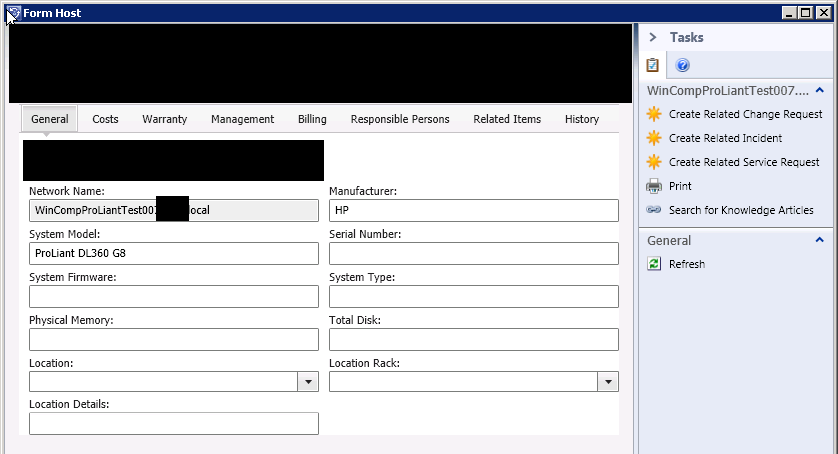 The HP ProLiant Management Pack for SCOM discovers physical ProLiant Servers and monitors them. By using the SCOM connector in SCSM you have all those Servers in the CMDB within minutes. But I often face customers that either do not have all ProLiant Server monitored by SCOM or are running older ProLiant Server for ESX (why ever …) that are not discovered. One thing you might think of is “Hey easy, I just create these ProLiant CIs manually in the Service Manager console”. Good thought, but impossible.
