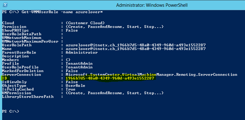 SPF will talk to SCVMM to deploy and manage virtual machines if the tenant requests it from the portal. Let’s check what happened in SCVMM so far. For that I use the VMM PowerShell module to connect to the SCVMM server and display the user roles.