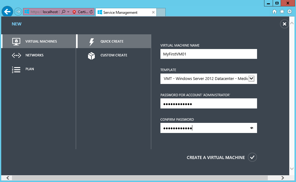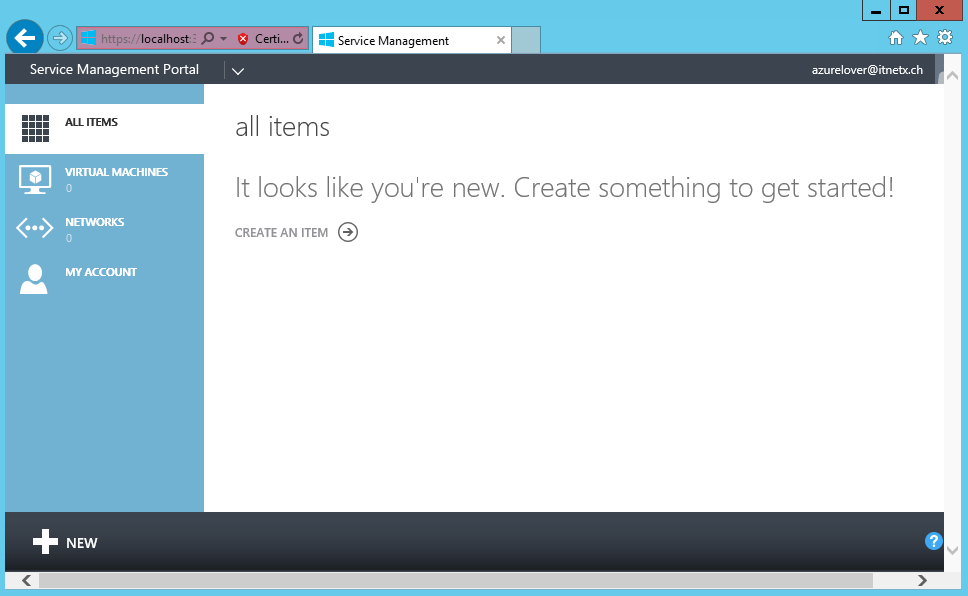After a few seconds the tenant is created and is logged in automatically. Depending on the selected plan and it’s configuration, he will see different areas on the portal. In this case I selected a plan that only allows the creation of virtual machines and networks.