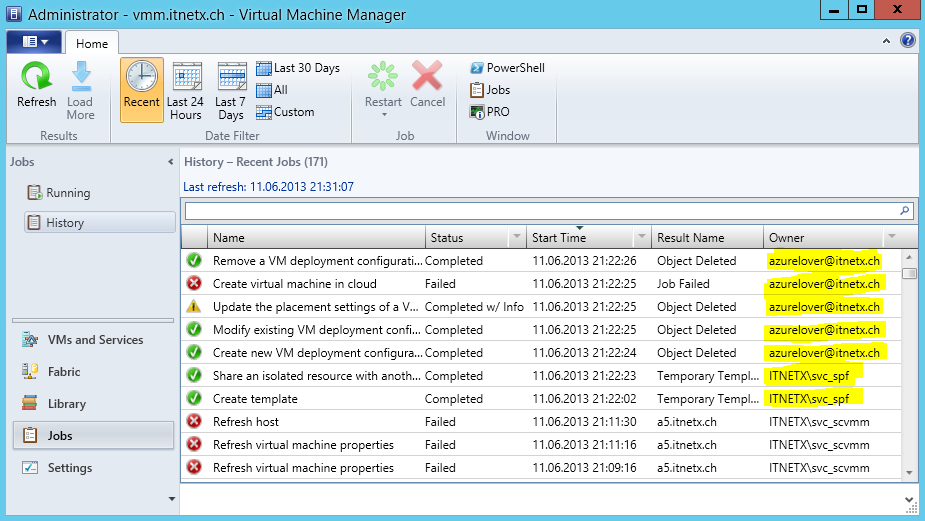 After some seconds you should see different jobs running in SCVMM that will deploy the new virtual machine. In this example the virtual machine creation job failed because the Hyper-V server was not running – doesn’t matter ![]()
