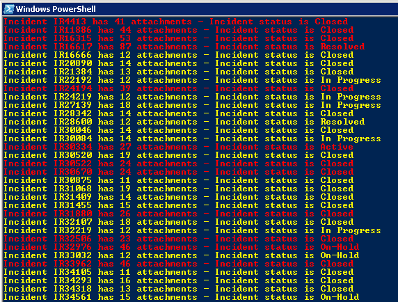 Incidents with less than 10 attachments are not displayes. If the count is between 10 and 19 the incident id, the count and the incident status are written to the console in yellow. If the count is greater than 20 the output is the same but in red. Just to play a little bit with the colors