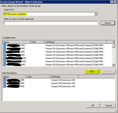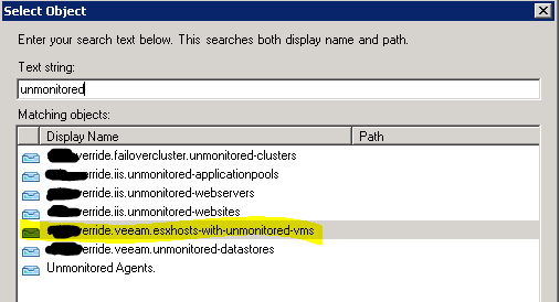 Virtual machines are not directly related to ESX/vSphere hosts. All virtualization hosts contain a “VM Discovery Container” object and this object will contain the virtual machines. That means we have to disable the object discovery for the “VM Discovery Containers” of the ESX/vSphere hosts that we don’t want to discover and monitor virtual machines. Select this object type in the picker and select the containers of the specific servers.