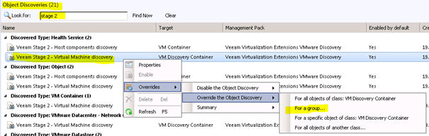 Close the configuration window. Now it’s time to override the object discovery for the virtual machines. Look for the discovery called “Veeam Stage 2 – Virtual Machine Discovery” and create a new override for the group we prepared in the last step.