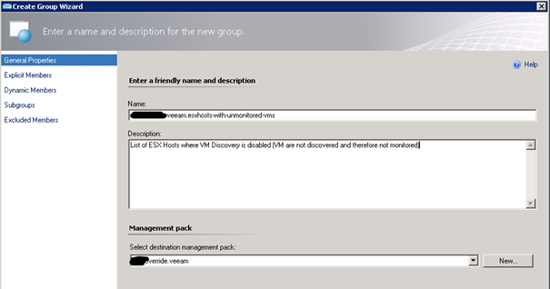 The way to get to the goal is easy and straightforward. You just need to disable the object discovery that discovers virtual machines on ESX/vSphere hosts. The override configuration can be targeted at either a specific ESX/vSphere host or a group. In this example I will create a group that will be filled up with objects. For those objects virtual machines will not be discovered anymore and will therefore not be monitored.