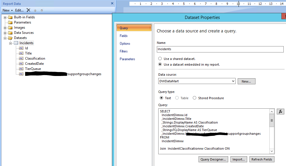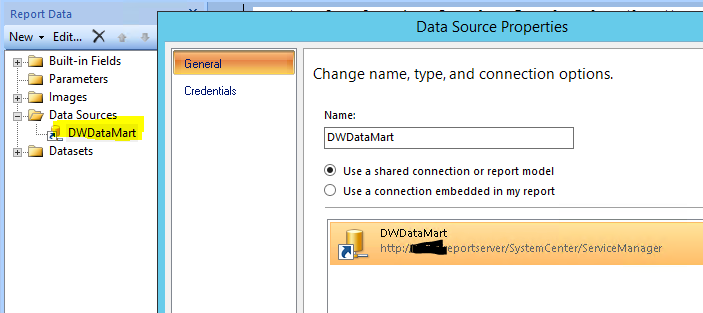 For my report, I added a shared data source. I used “DWDataMart” one from the SCSM reporting server.