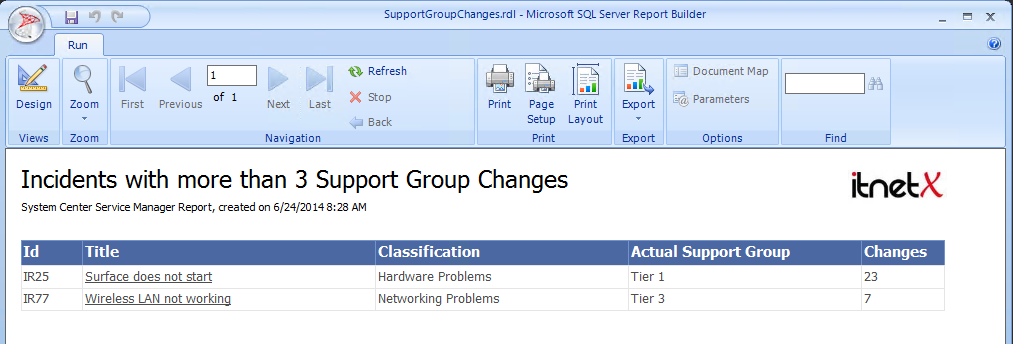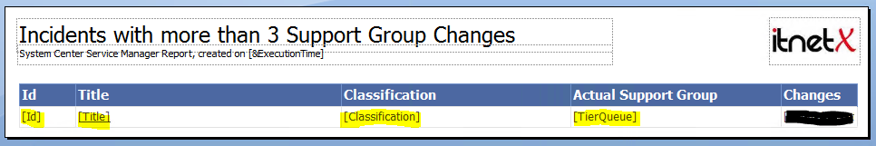 Here we go with the full query. I marked the property for the suport group changes so that you know what needs to be changed for your environment. Also I stated that I want to display all incidents with more than 2 support group changes. At the end you see that I added some joins to make sure the enumerations are not displayed with their IDs but with a translated display string. You can develop the query in SQL Management Studio or directly in the Report Builder, whatever you prefer.