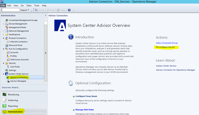 Once added you can connect your SCOM infrastructure to OpInsights. In SCOM this is still called Advisor, but I guess this will be changed soon. In my case the connection is already configured, therefore the task is called “Re-configure Advisor”.
