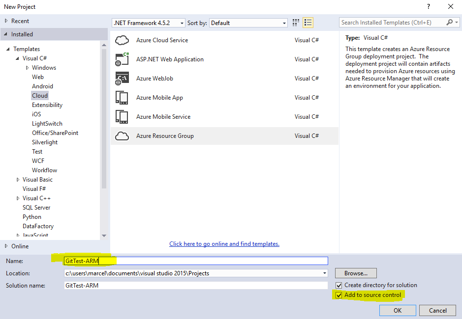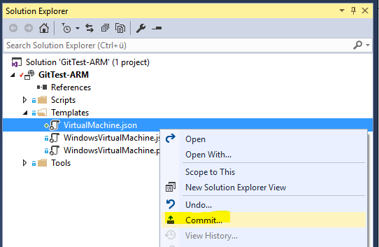 Now I start Visual Studio on my dev machine and create a new project. In this example I create a project for a “Azure Resource Manager” template, gut it could be anything you like.