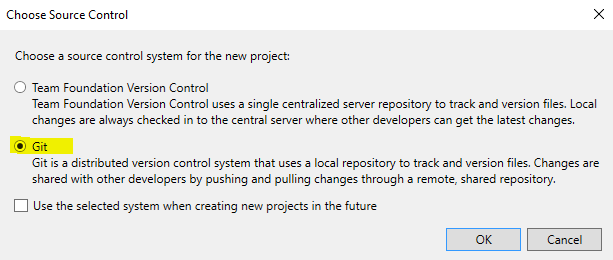 I check “Add to source control” which gives me two option for source control: TFS or Git. There is no “GitHub” option available. This means that I need to install “Git for Windows” on my dev machine and create a local Git repository. Everything will be source controlled locally on my machine in a first step.