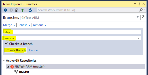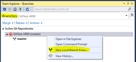 In Visual Studio I can use the “Team Explorer – Branches” to create a new branch from my “master” branch.