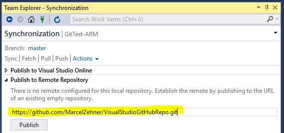 Because this is my first sync to a remote repository, I need to add the exact path. In my case, the remote repository lives on GitHub, so I need to provide the correct URL to that repository.