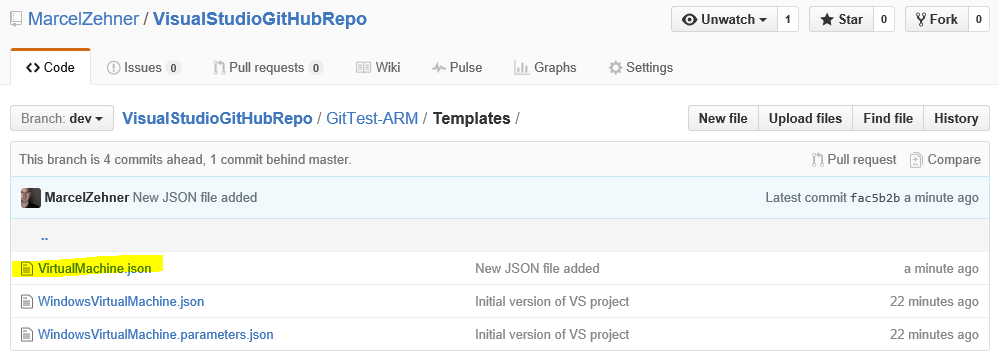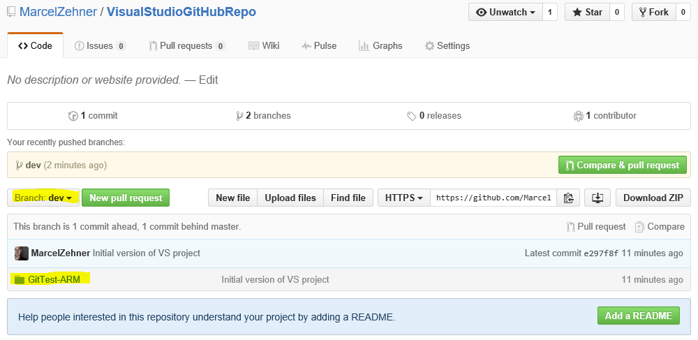 If you connect back to the GitHub website, you should now see that a new branch has been created. It has the same name as the local Git branch. And you should see the appropriate Visual Studio project files.