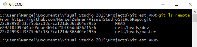 When using “Git CMD” that was installed with “Git for Windows”, you can change to the Visual Studio project folder and see that a remote repository was configured for your local Git repository.