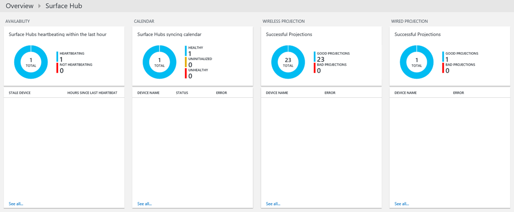 This area shows if your Surface Hub devices are actually heartbeating or not. This is the most important information the solution delivers. Because these devices are awesome, chances that they get stolen are very, very high ![]()