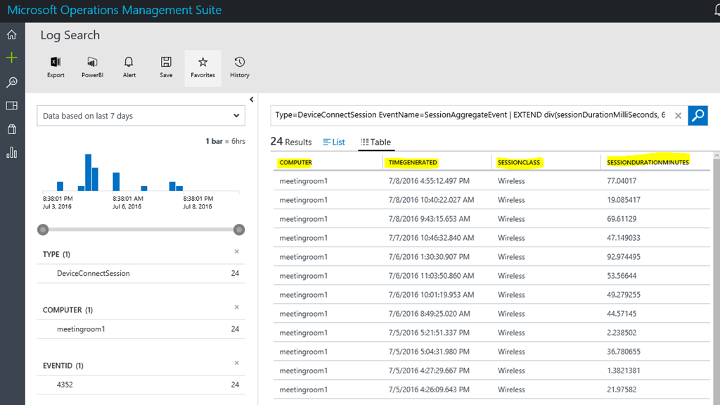 Type=DeviceConnectSession EventName=SessionAggregateEvent | EXTEND div(sessionDurationMilliSeconds, 60000) as SessionDurationMinutes | Select Computer,TimeGenerated,sessionClass,SessionDurationMinutes