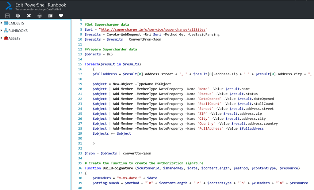 Now for this example I not only read the information, but convert it into a custom Powershell object, add another property – the fully concatenated address – and convert it back to a JSON file. Once the data is ready, we need 2 functions to prepare the connection and send the data to OMS. Here we go with the full script: