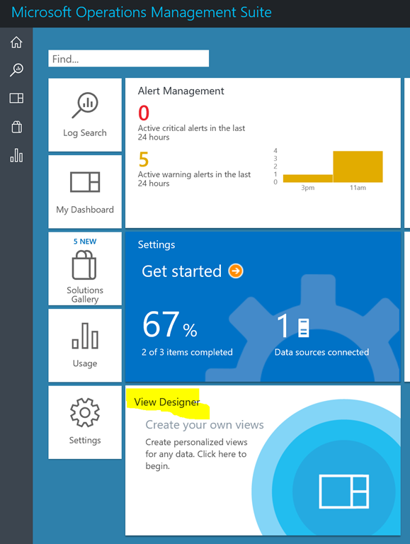 Now as the data is available in OMS lets create a view to visualize it with the view designer. In the overview you should see the view designer. If this is not the case you might need to enable it under configuration\preview features.
