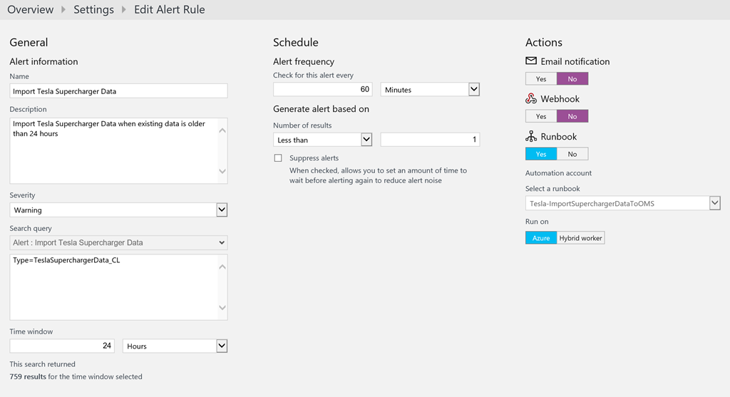 In the alert configuration I use the query to get out all Tesla Supercharger data that’s available in OMS. I use a time window of 24 hours and check it every 60 minutes. That means that every hour the system will check if there is Tesla Supercharger data in OMS that is older than 24 hours. If this is the case, I trigger a runbook that lives in my connected Azure Automation account. The runbook is based on the exact same script that I showed in step 1.