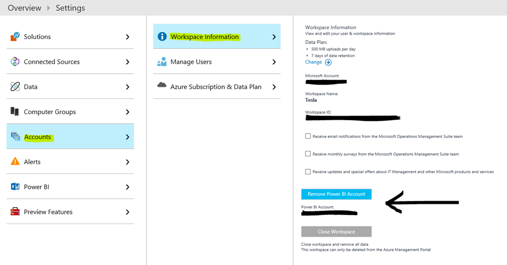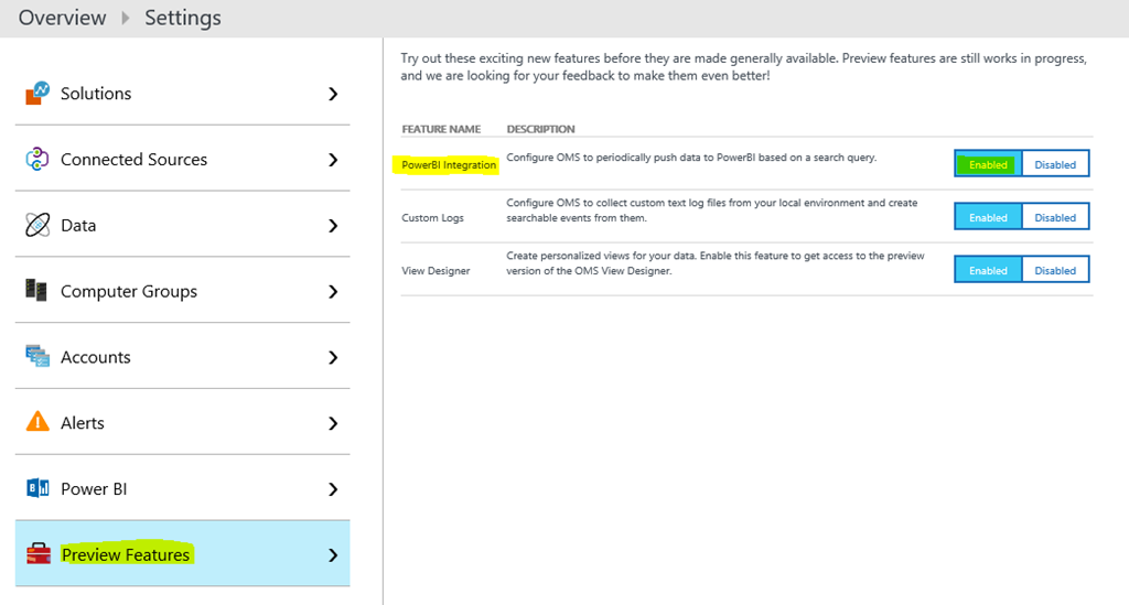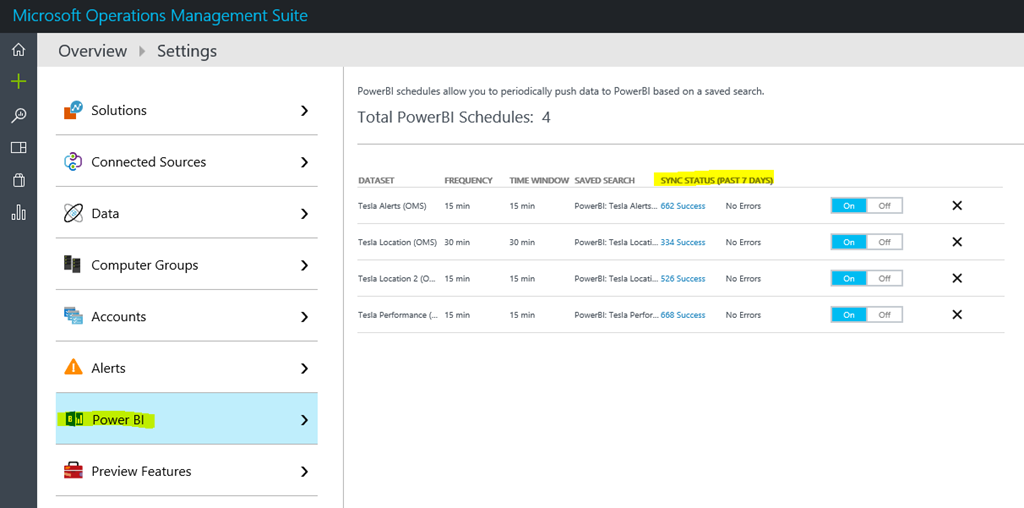 Once configured, you can use OMS to track if data gets forwarded correctly. By using Configuration\PowerBI you can see all configured forwarders and if needed enable/disable them. And you can see if the sync status was successful.