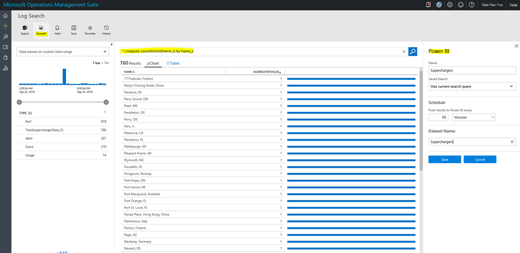 In this example I will forward all Tesla Supercharger data to PowerBI. After the query is in the search field, I use the PowerBI option and configure OMS to forward the data every 15 minutes.