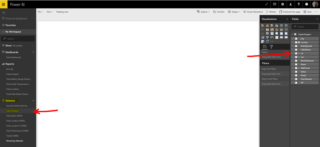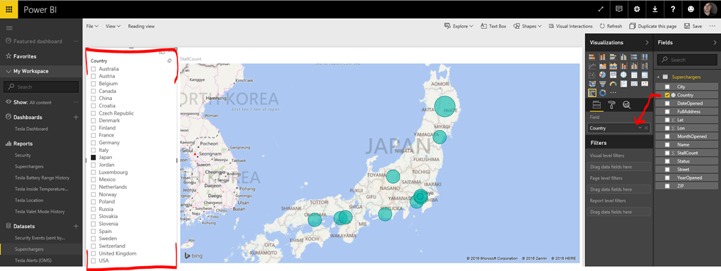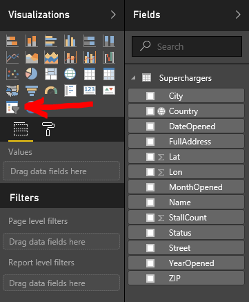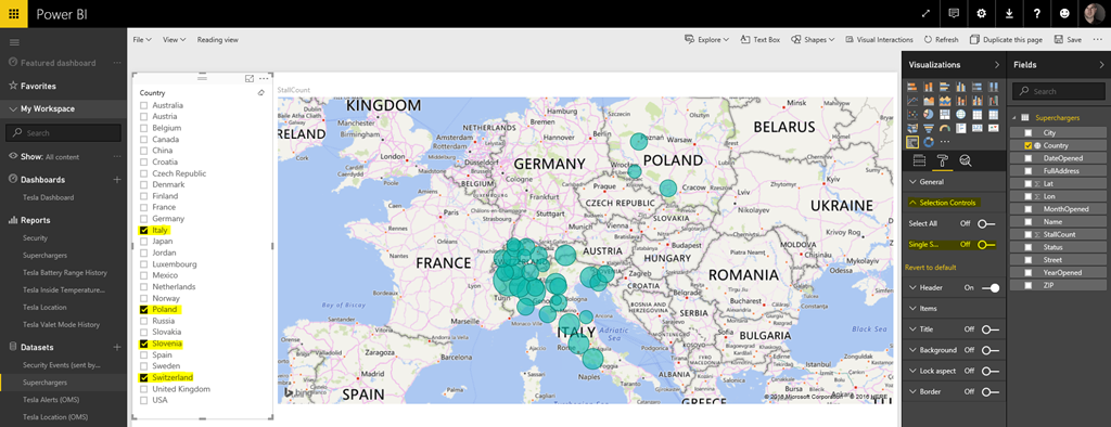 Now let’s add a slicer that allows to easily select Superchargers in a specific country.