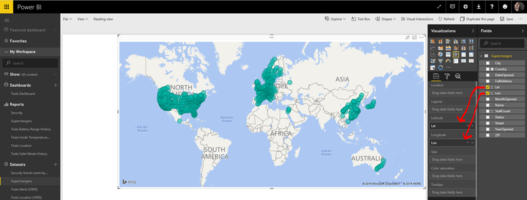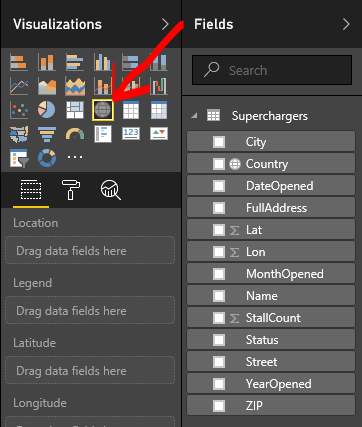 Now I add a new map visual to the report, then drag the lon and lat fields to the corresponding fields of the visual.
