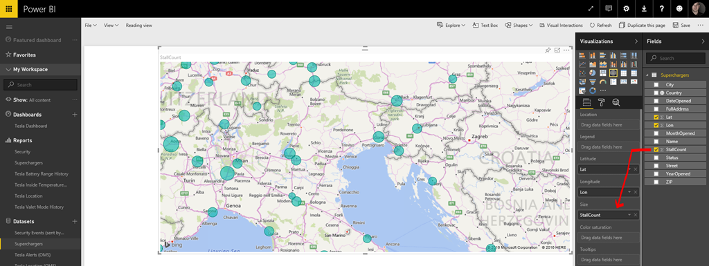 To visualize the different stall sizes, I also drag the stall count field to the size field of the visual. When you now zoom it you will discover that the different Superchargers are displayed in different sizes depending on their actual stall count.