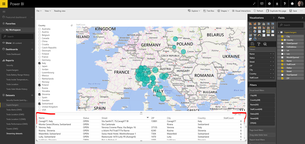 As a last step I added a table visual to display the most important details of the Tesla Superchargers.